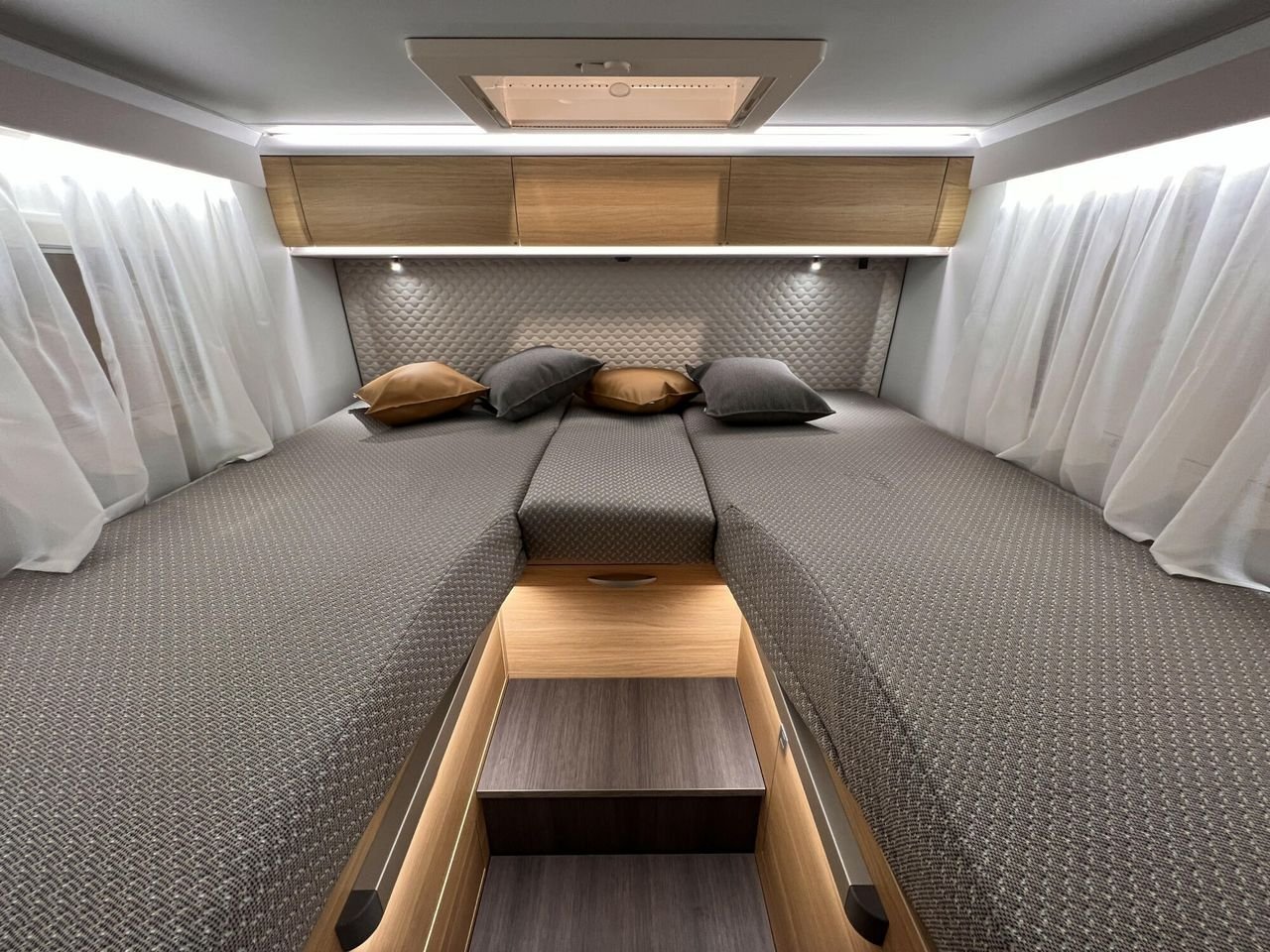 La Matrix dispose de série d’un lit abaissant électrique à l’avant. SL est livré avec deux lits simples à l’arrière, ainsi qu’un lit transformable en grand lit.