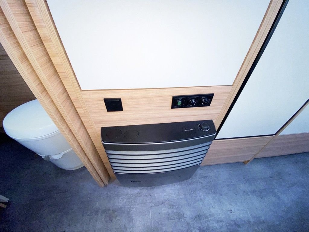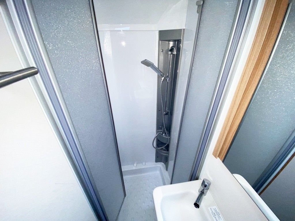 Au fond se trouve la chambre à coucher avec un grand lit double, à côté de laquelle se trouve la salle de bains avec des toilettes, un lavabo et une grande cabine de douche. Ici, les adultes et les enfants peuvent prendre une bonne douche dans la caravane. La caravane est également équipée d’un chauffage au gaz et d’un chauffage électrique, ainsi que d’un chauffage par le sol.