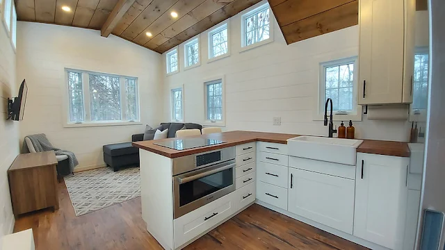 Superbe maison de 37 m² avec cuisine et salon à aire ouverte. Cette maison offre une sensation d’espace grâce à ses 24 fenêtres à haut rendement énergétique et ses plafonds de 3,3 m.