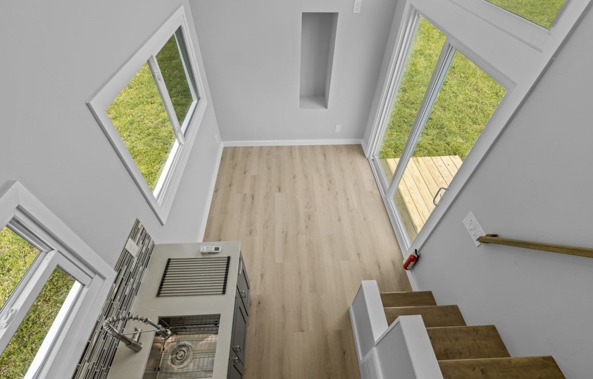 Le salon dispose d’un haut plafond avec beaucoup de verre pour profiter de la lumière naturelle et des vues extérieures. Le niveau principal mesure 8′-6″ x 20′-0″, ce qui en fait 18m² d’espace habitable. Le loft est accessible par un escalier avec des espaces de rangement.